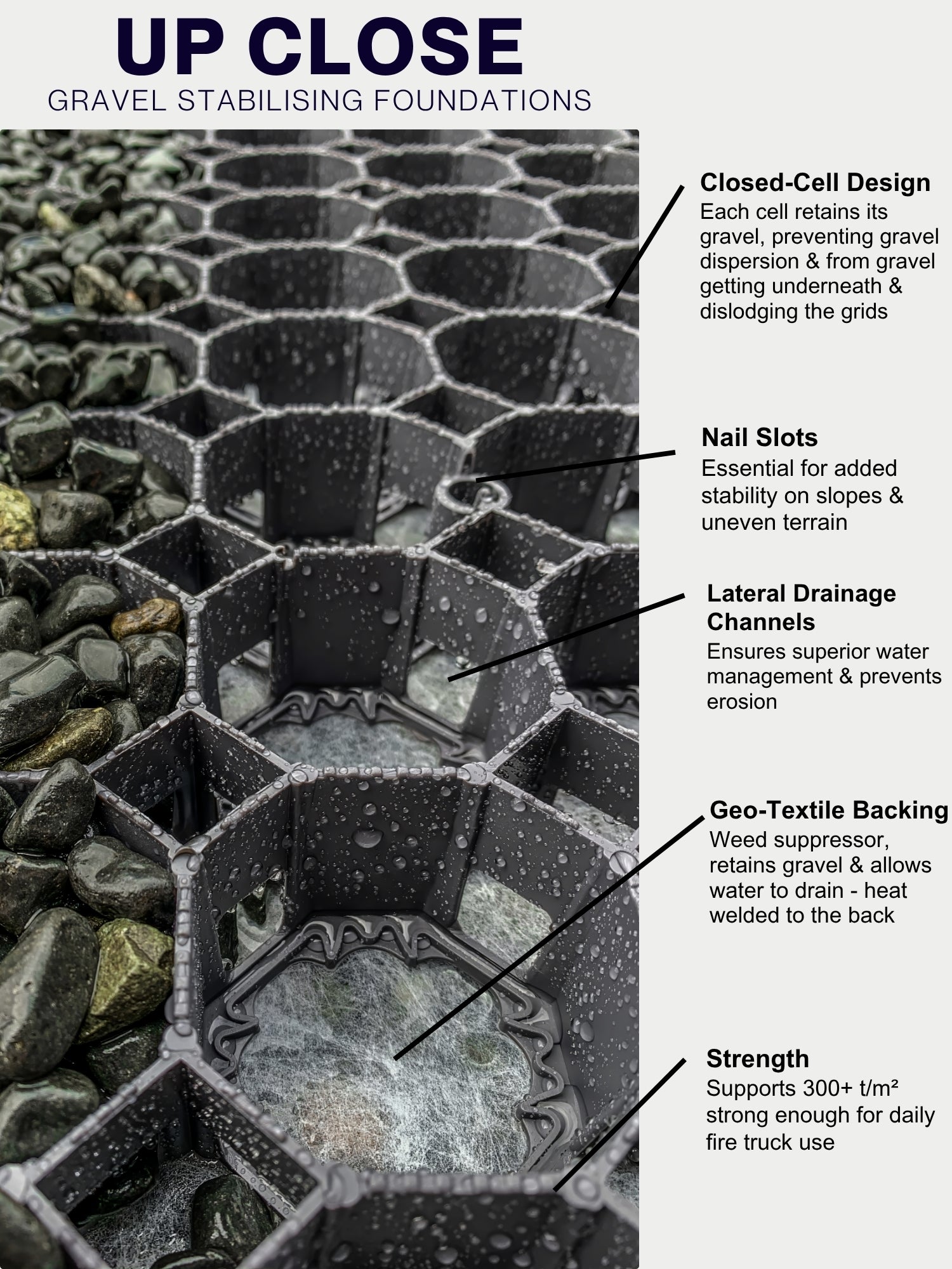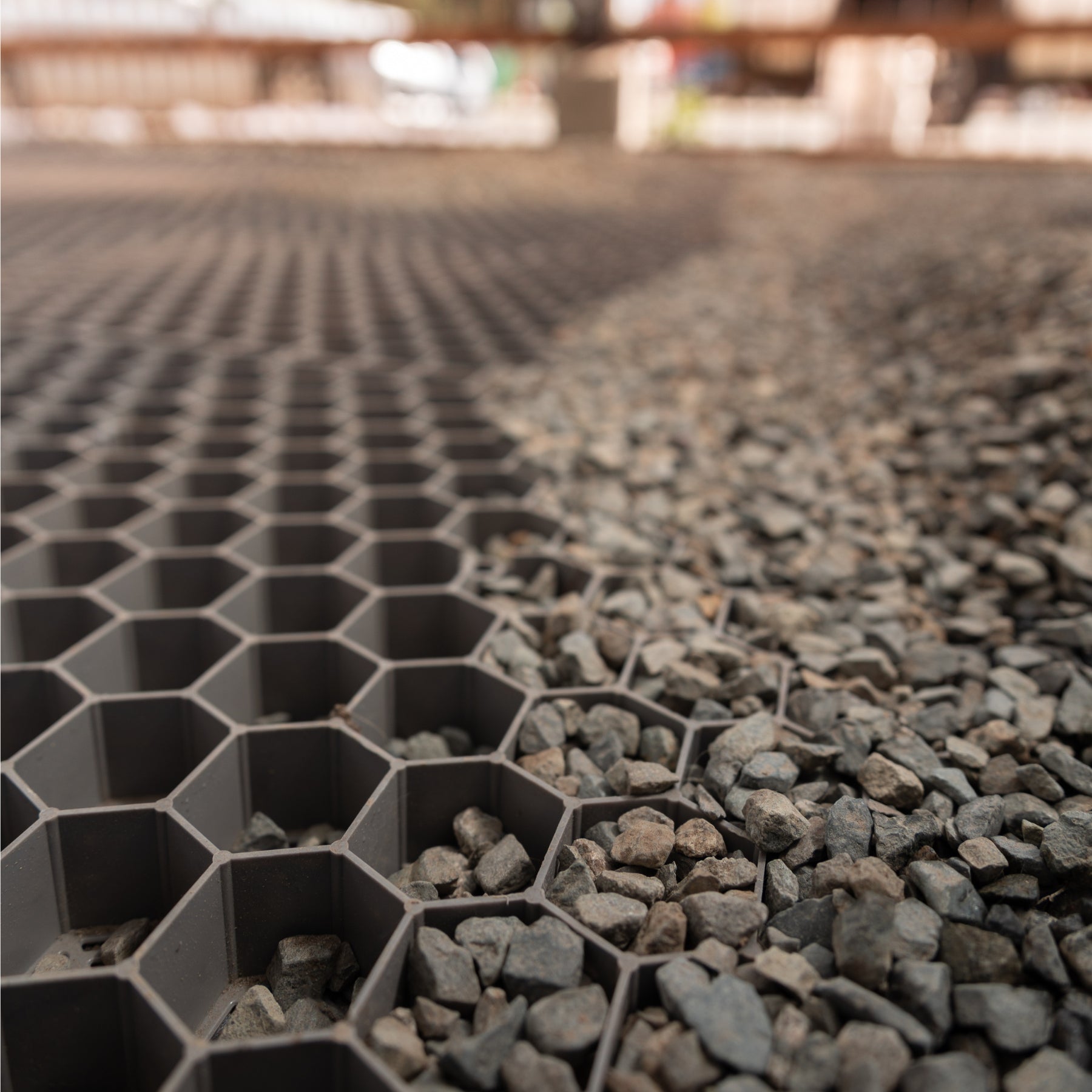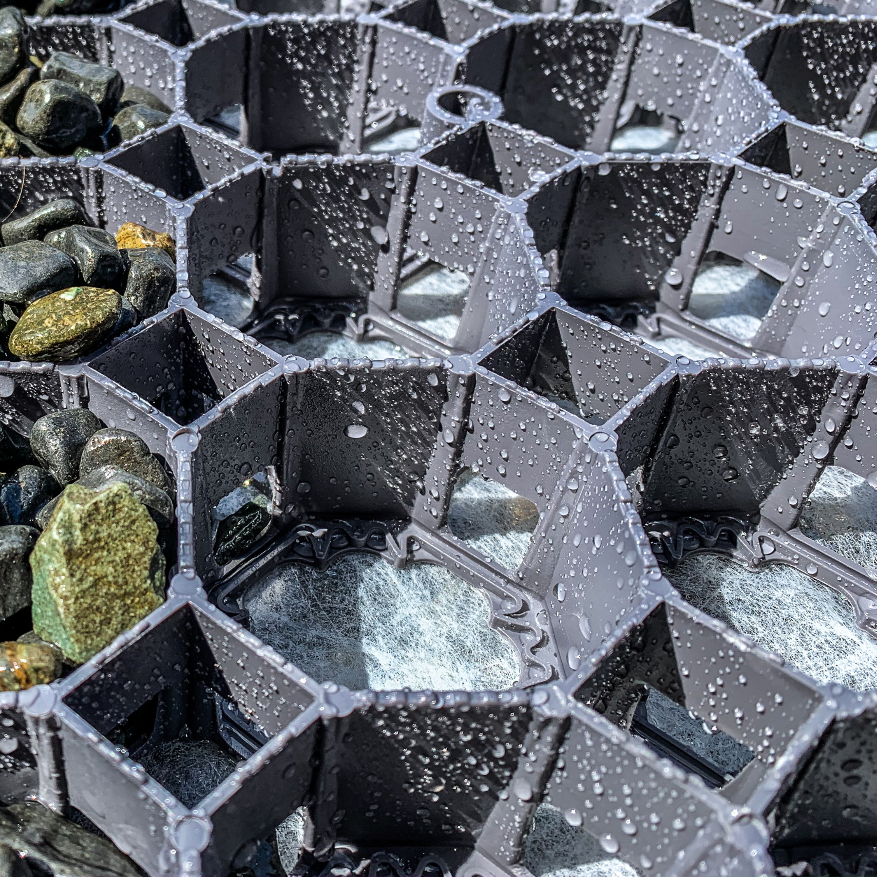 All our systems feature a closed-cell design, providing a permeable yet solid underside by heat welding a geo textile to the back. This innovative structure ensures your clean gravel infill remains separate from the sub-base, preventing any mixing or displacement that could dislodge the grids. The result? A stable, durable surface that stays clean and permeable, even under heavy use.