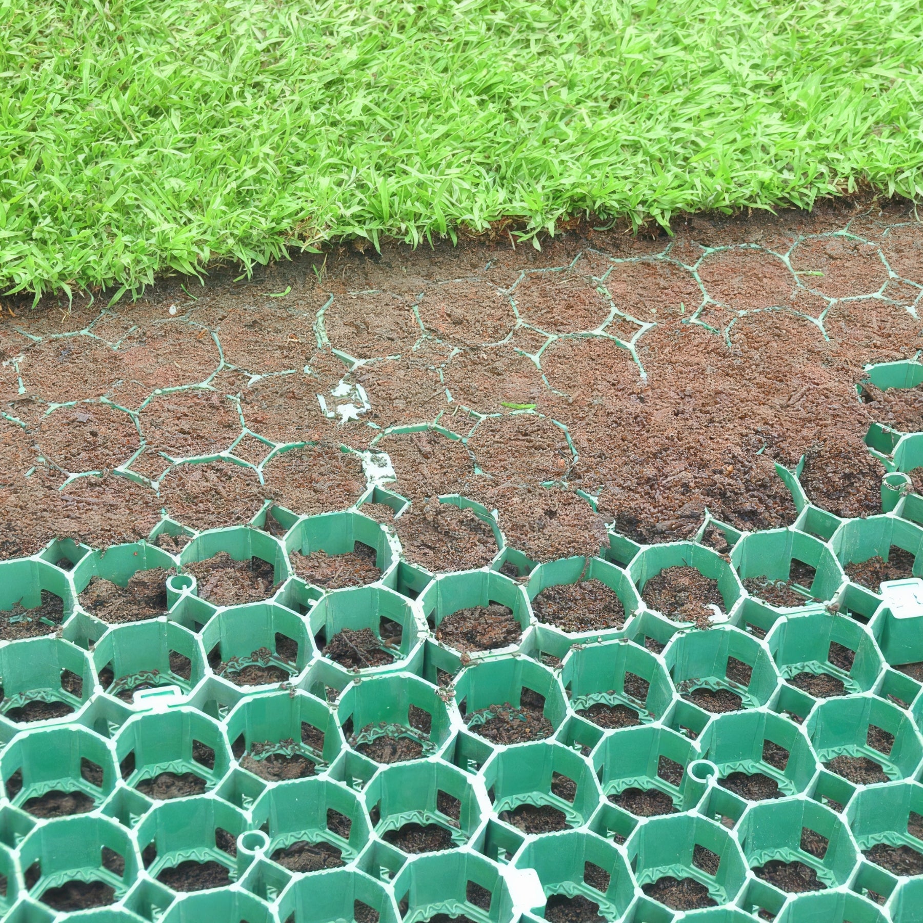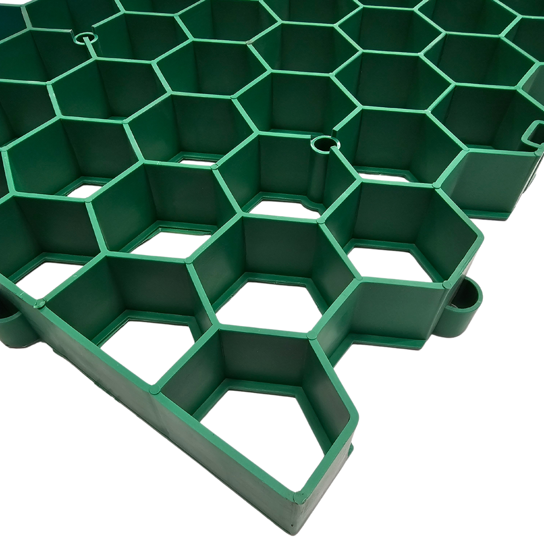 Our company exclusively provides a grid tailored for sloped applications, setting us apart in the industry. The 60-40 grid, with its innovative lateral drainage design, ensures seamless water flow between cells, effectively preventing any accumulation on slopes. Additionally, the grid is equipped with dedicated slots for inserting 8-12 inch galvanized nails, anchoring the grid firmly in place and virtually eliminating slippage risks. This combination of efficient drainage, secure anchoring, advanced geo-textile, and hexagonal design culminates in a foundation of unmatched permeability and stability.